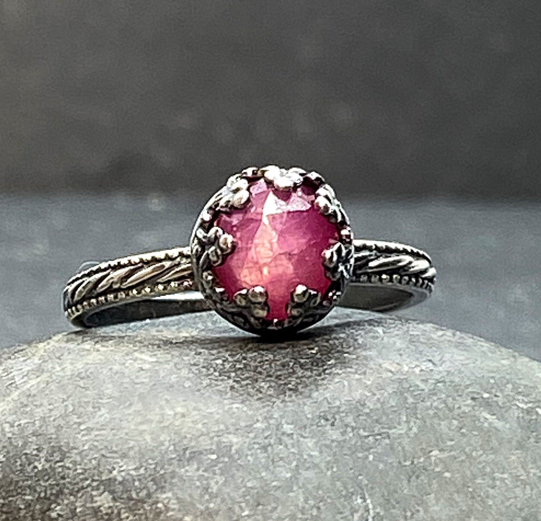 Rose Cut Pink Sapphire set in solid sterling silver with an antiqued finish. I handmade this ring from start to finish here in my little shop. This ring is made to order so be sure to check my processing time. Feel free to contact me for custom work.